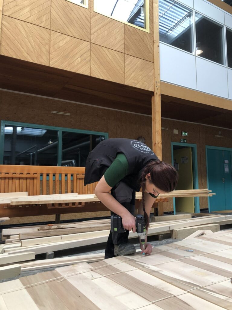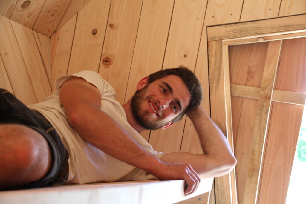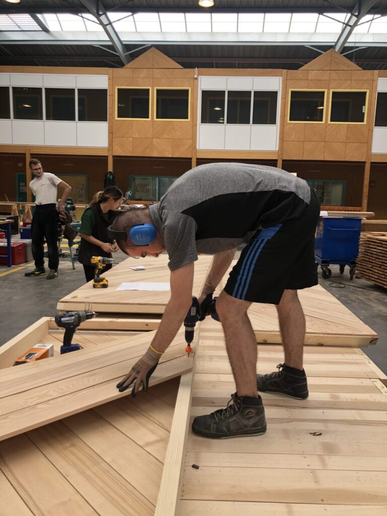 Témoignage de l’équipe « Comme dans de nombreux groupes la divisions en 3 modules en plan a été rapidement intuitive pour répondre aux problématiques de préfabrication et de transport. Pour ce qui est de la façade l’idée de Chapelle nous a amené à dessiner un triangle, puis à en arrondir les côtés pour gagner en spatialité en maintenant la même emprise au sol. Une fois ces principes fixés, on a travaillé la structure dans les détails pour la rendre la plus efficace et élégante possible. L’étape la plus chronophage a été la préfabrication dans la halle, mais elle s’est réalisée de manière assez efficace et organisée et nous a permis de gagner du temps pour l’assemblage des éléments sur le site. La plus grande difficulté commune à tous, au-delà du peu de temps imparti pour le chantier, a été d’enchaîner autant de longues journées de travail manuel alors qu’une grande majorité des participants n’avaient que très peu d’expérience en construction. Mais les difficultés rencontrées et l’intensité de la semaine partagée ont renforcé les liens entre les participants et nous rendent d’autant plus fiers des résultats et de la variété d’idées réalisées jusqu’au bout. »