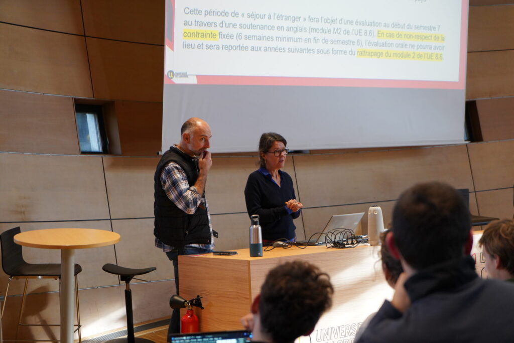 À 13h30, Arnaud Besserer, Flavie Najean et Sophie Petitjean ont ouvert l’après-midi en rappelant les principes des mobilités sortantes : calendrier et étapes clés, critères d’éligibilité, documents à préparer, articulation avec le parcours pédagogique. Un diaporama a présenté l’éventail des universités partenaires, des semestres d’études aux projets de fin d’études, en passant par les doubles diplômes.