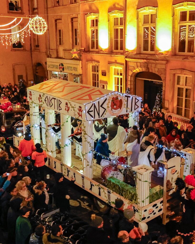 Chaque année, le premier samedi de décembre, la fête de la Saint-Nicolas transforme Épinal en une immense scène festive. Plus de 60 chars et fanfares défilent sur près de trois kilomètres, offrant un spectacle populaire, lumineux et haut en couleur. Fanfares tonitruantes, chars illuminés et foule enthousiaste : la magie opère à chaque édition. Parmi ces chars, celui de l’ENSTIB figure chaque année parmi les favoris du public, et ce pour deux raisons essentielles.