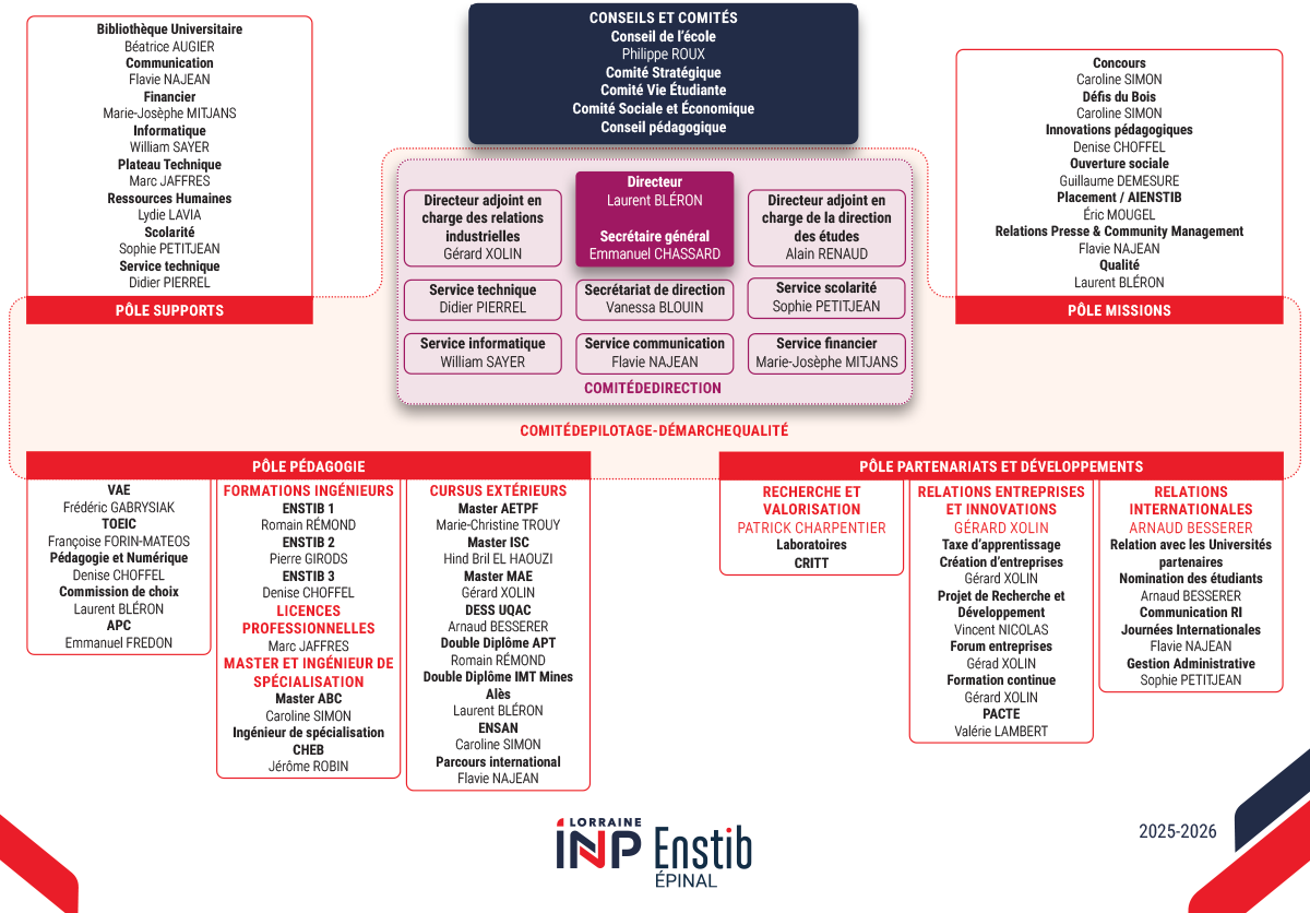 Sur le Campus Bois, l’ENSTIB emploie au 31 août 2024 : 32 enseignants, 22 BIATSS (personnels des bibliothèques, ingénieurs, administratifs, techniques, sociaux et de santé) et 2 personnels mis à disposition par la Ville d’Epinal ( 1 technicien et 1 agent administratif).